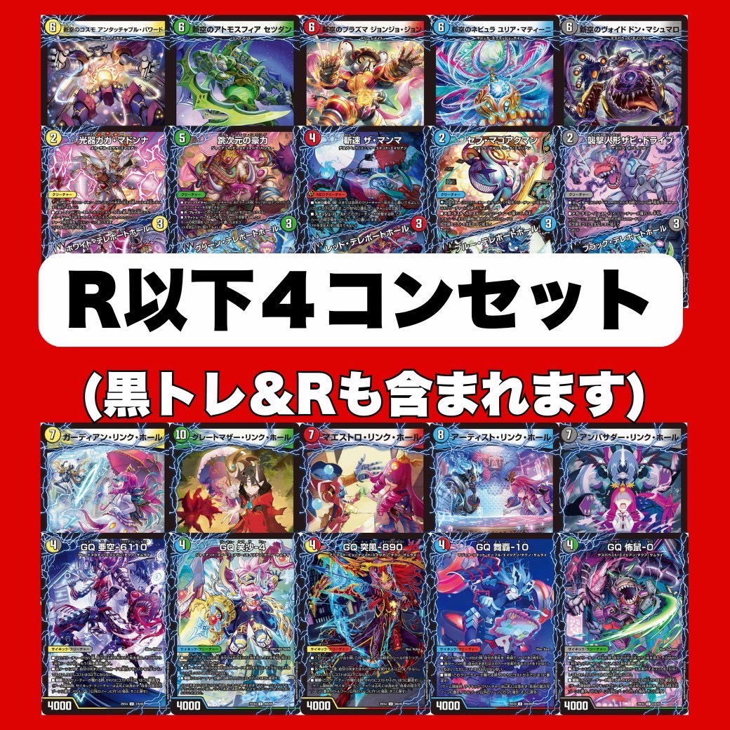 U(アンコモン)・C(コモン)・黒トレ以下の各4枚コンプセットをまとめて封入しておりますが、4枚そろって無い可能性もございます。